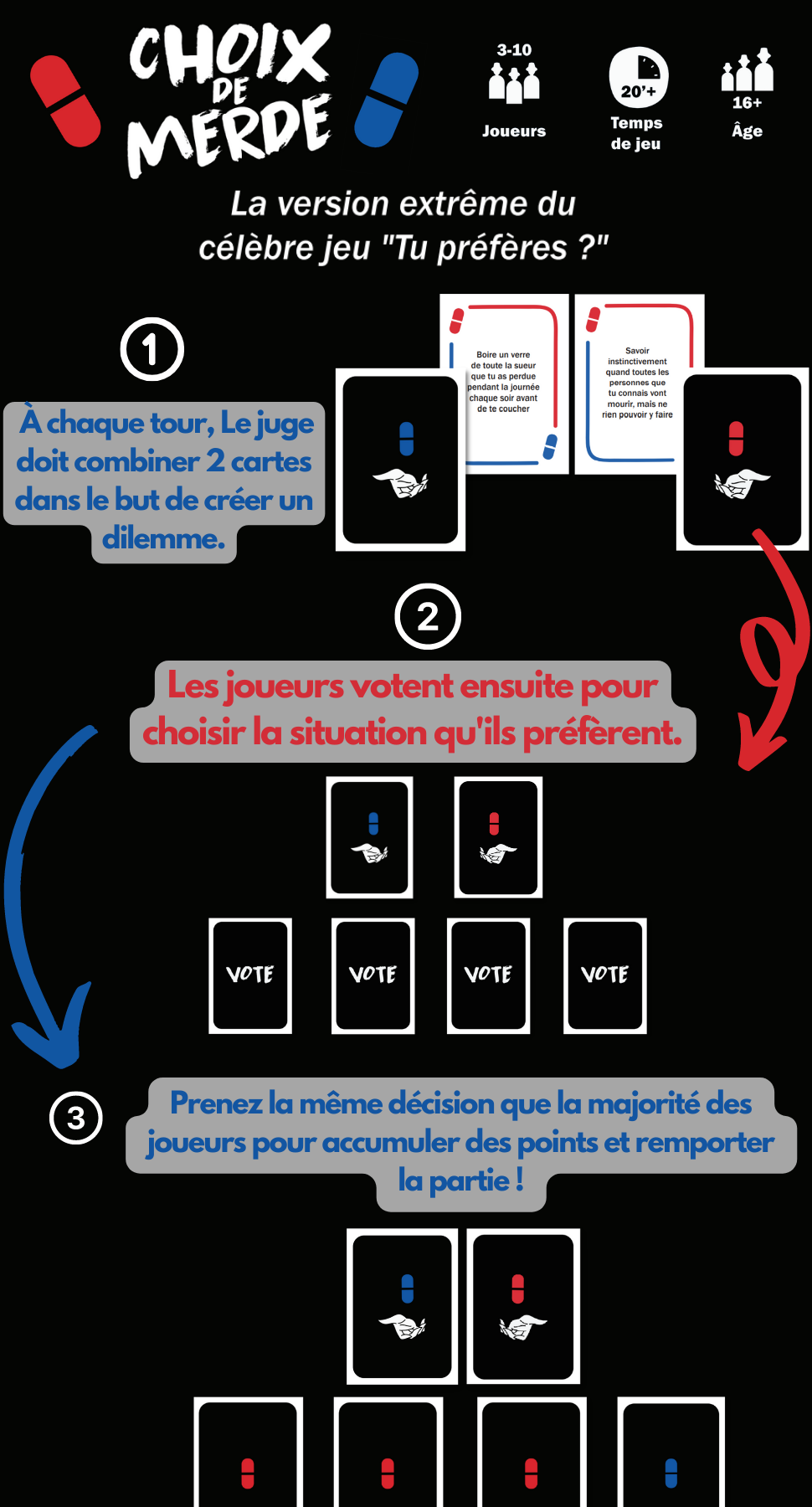 "Choix de Merde" est le jeu des dilemmes qui mettra vos choix moraux à l'épreuve. Avec des questions du type "Tu préfères ?" ce jeu de société va vous mettre dans des situations impossibles et vous obliger à justifier vos choix. Le jeu contient également des questions plus osées pour ceux qui préfèrent l'humour noir et le trash. "Choix de Merde" est parfait pour les soirées entre amis ou les apéros où vous cherchez à vous divertir et à passer un bon moment. Alors, prêt à relever le défi et à faire face à des dilemmes impossibles avec "Choix de Merde" ?