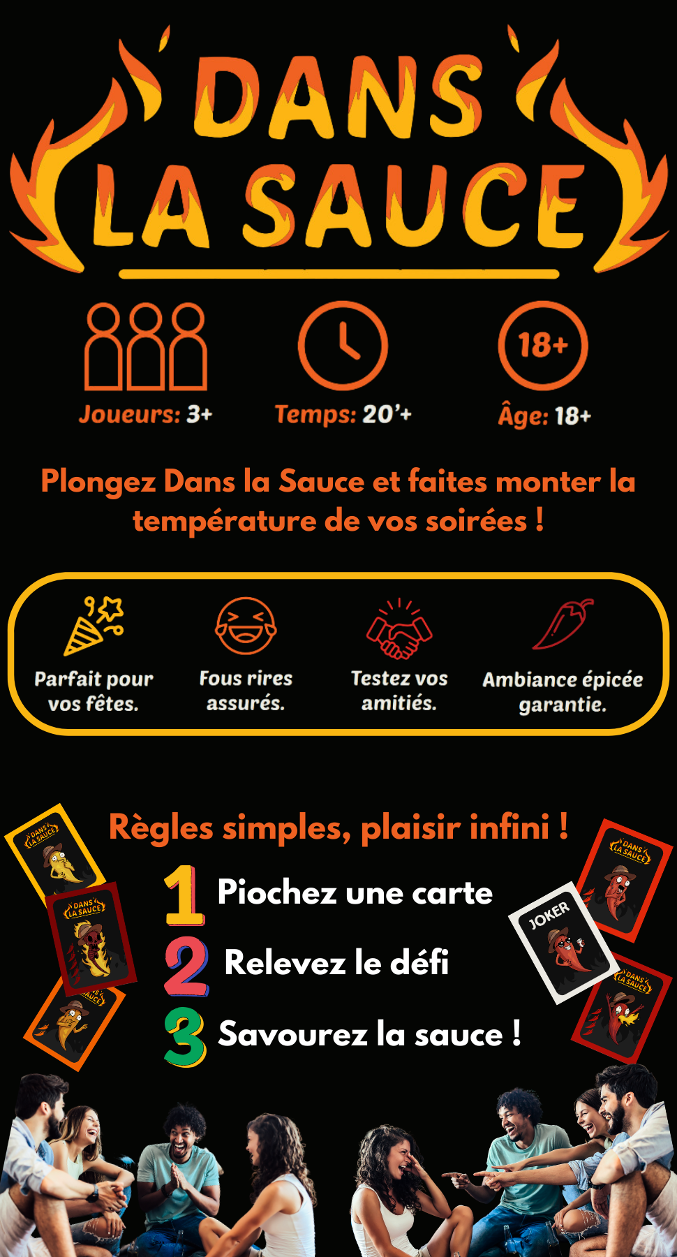 Conçu pour épicer vos soirées et mettre vos amitiés à l'épreuve, ce jeu de société dynamique est la quintessence du divertissement convivial. Avec des niveaux progressifs de défis et d'humour, il est parfait pour toutes les occasions, des soirées tranquilles entre amis aux grandes fêtes. Ne laissez pas la simplicité de sa boîte compacte vous tromper; "Dans la Sauce" est riche en rebondissements et plein d'énergie. C'est le choix idéal pour les amateurs de jeux qui cherchent à briser la glace, créer une ambiance électrisante et passer un moment inoubliable. Alors si vous recherchez un jeu qui allie rires, stratégie et un zeste de piquant, "Dans la Sauce" est le jeu qu'il vous faut.