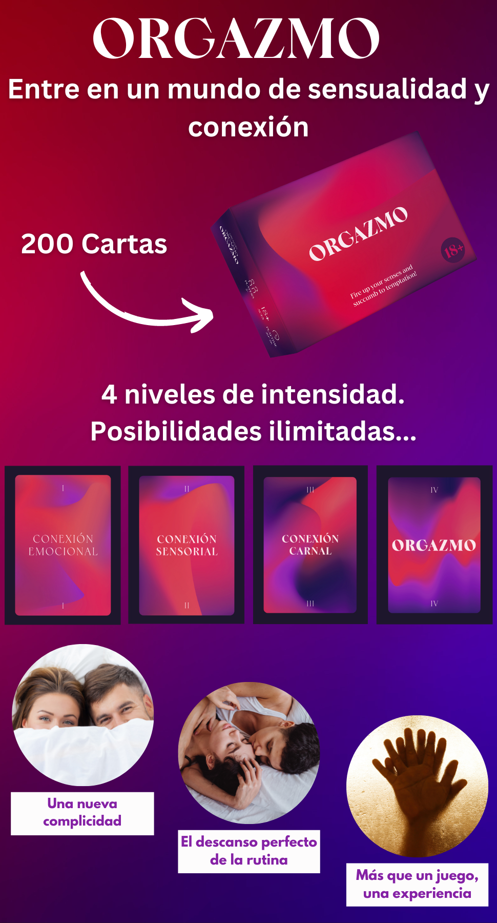 Orgazmo is not just a board game for adults; It is a complete experience designed to rekindle passion, strengthen emotional bonds and explore new dimensions of sensuality and intimacy. With its 200 carefully crafted cards, divided into four levels of connection that range from the emotional to the carnal, Orgazmo goes far beyond traditional couples games. It offers a playful and engaging way to deepen your relationship while having fun. Ideal for nights out or as a gift for Valentine's Day, birthdays or any other special occasion. Don't miss the opportunity to spice up your love life with Orgazmo.