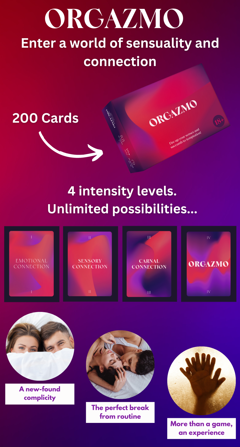Orgazmo is not just a board game for adults; it's a complete experience designed to rekindle passion, strengthen emotional bonds and explore new dimensions of sensuality and intimacy. With its 200 carefully crafted cards, divided into four levels of connection ranging from the emotional to the carnal, Orgazmo goes far beyond traditional couple games. It offers a playful and engaging way to deepen your relationship while having fun. Ideal for evenings out or as a gift for Valentine's Day, birthdays or any other special occasion. Don't miss your chance to spice up your love life with Orgazmo.